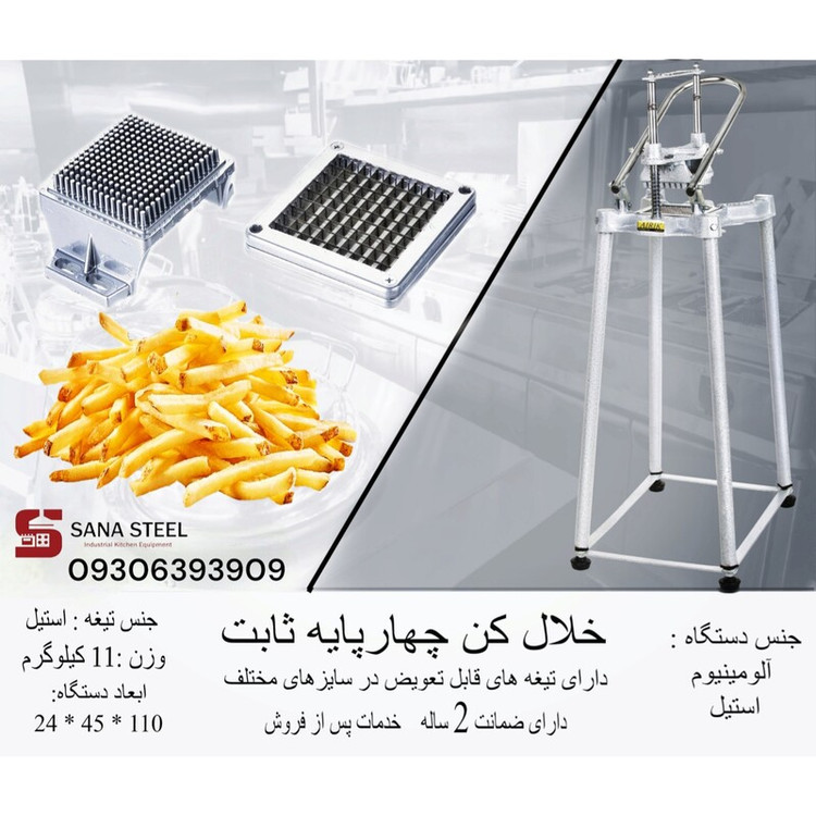 عملکرد خلال کن چهارپایه ای ثابت در آشپزخانههای صنعتی و حرفهای بسیار مؤثر و کاربردی است. این دستگاه برای خرد کردن و خلال کردن سریع و یکنواخت انواع سبزیجات، سیبزمینی، هویج و سایر مواد غذایی طراحی شده است. پایههای فلزی ثابت آن باعث میشوند دستگاه هنگام کار کاملاً پایدار باشد و خطر لغزش یا واژگونی نداشته باشد.